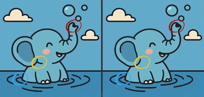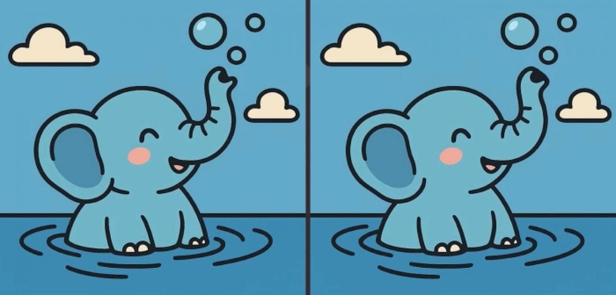 Evo dvije slike slona koji se igra u vodi. Na prvi pogled potpuno su identični, ali to je samo iluzija. Na slikama su skrivene tri male razlike.