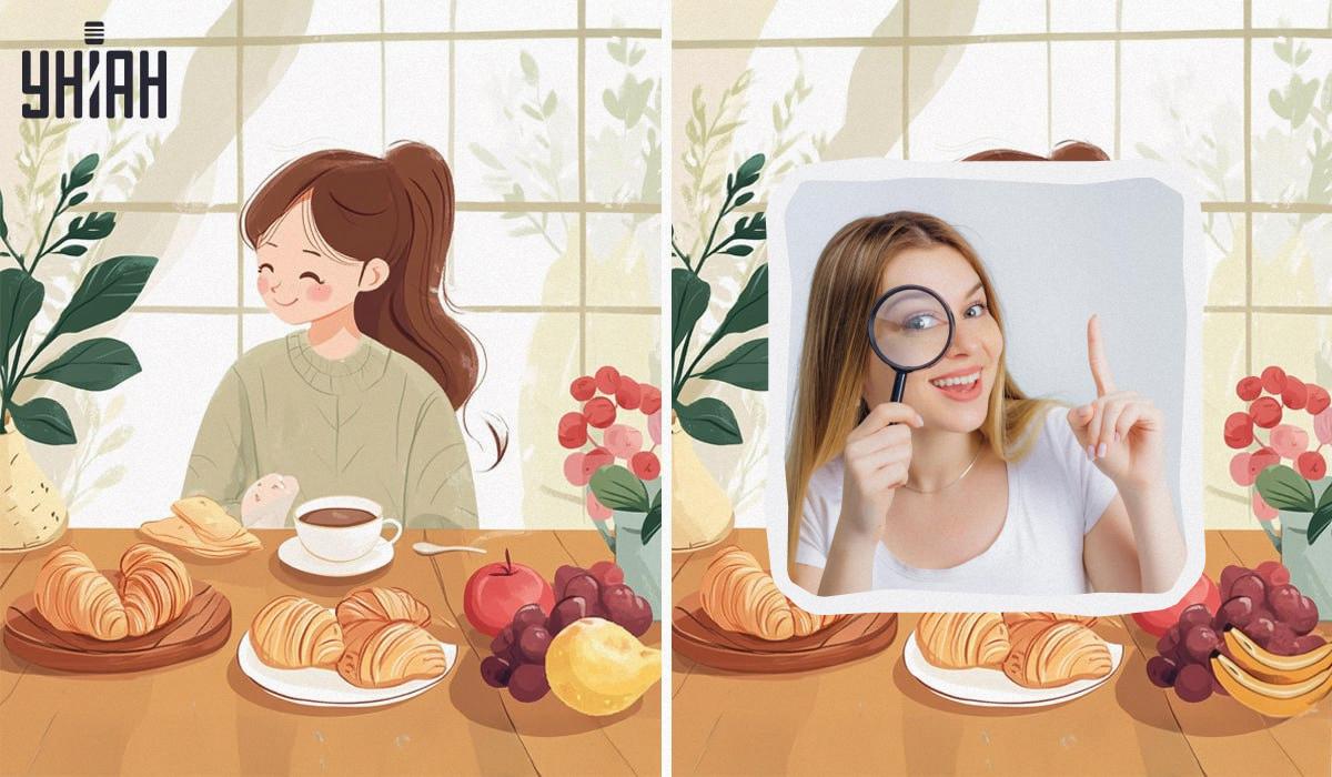 Slike prikazuju slatku djevojku kako uživa u doručku u svojoj kuhinji. Pije kavu (ili čaj) s ukusnim kroasanima. A za desert očekuje voće. Slike izgledaju gotovo identično, s četiri suptilne razlike između njih. Možete li ih pronaći?