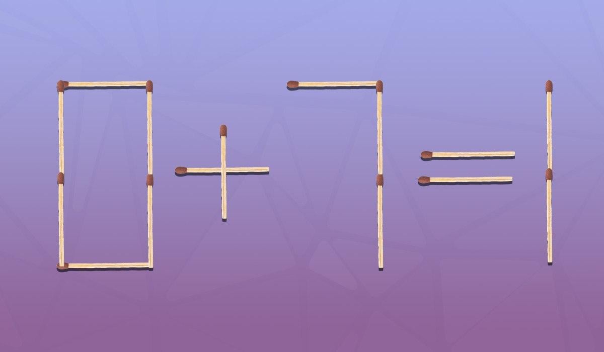 Dakle, ispod ćete vidjeti sliku na kojoj je jednakost 0+7=1 postavljena pomoću šibica. Jasno je da je ovdje greška. Vaš zadatak je ispraviti jednakost tako što ćete napraviti malu promjenu.