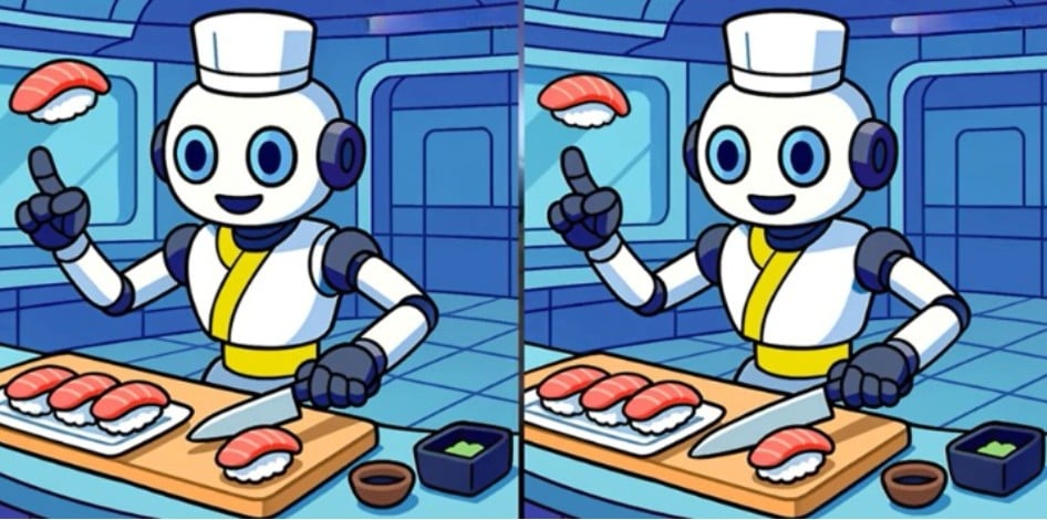 Predstavljene slike prikazuju sushi čovjeka robota. Na prvi pogled oba crteža izgledaju potpuno isto, ali među njima se kriju tri male razlike.
