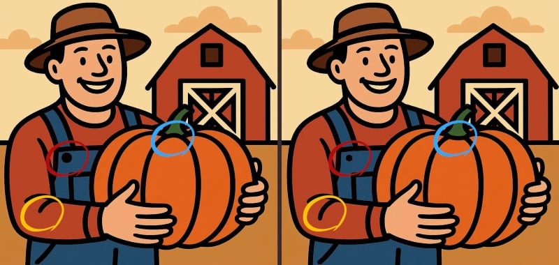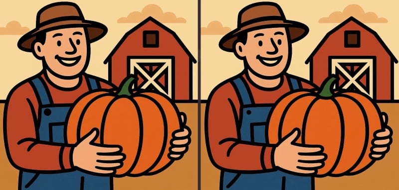 Ovaj put vidite sliku sa farmerom i bundevom. Na prvi pogled, slike se potpuno podudaraju, ali to nije tako – među njima se kriju tri razlike.