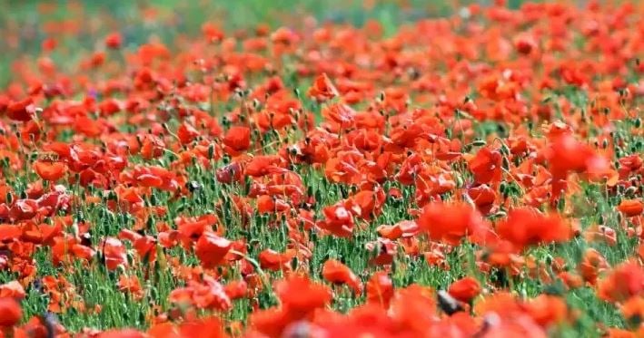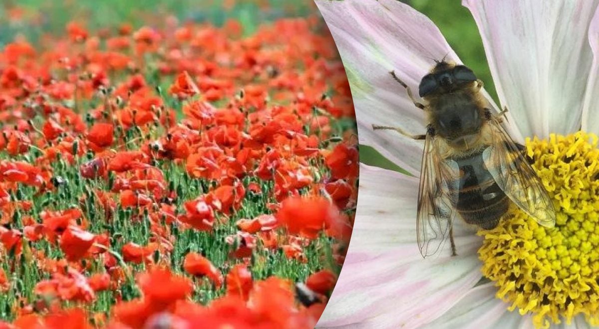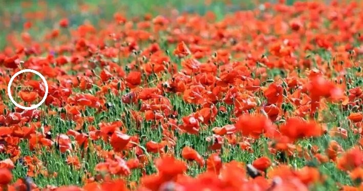 Na fotografiji vidimo polje s makovima. Cvijeće prekriva polje kao debeo crveno-zeleni pokrivač, a kraja mu se ne nazire. Čini se da tu bezgraničnost cvjetne ljepote nije poremetila niti jedna životinja. Ali to nije tako – negdje među cvijećem skriva se pčela koju će biti vrlo teško primijetiti.