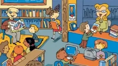 Na slici vidimo knjižnicu s puno djece. Neki od njih traže knjige koje bi htjeli pročitati, drugi sjede za računalima ili međusobno komuniciraju.