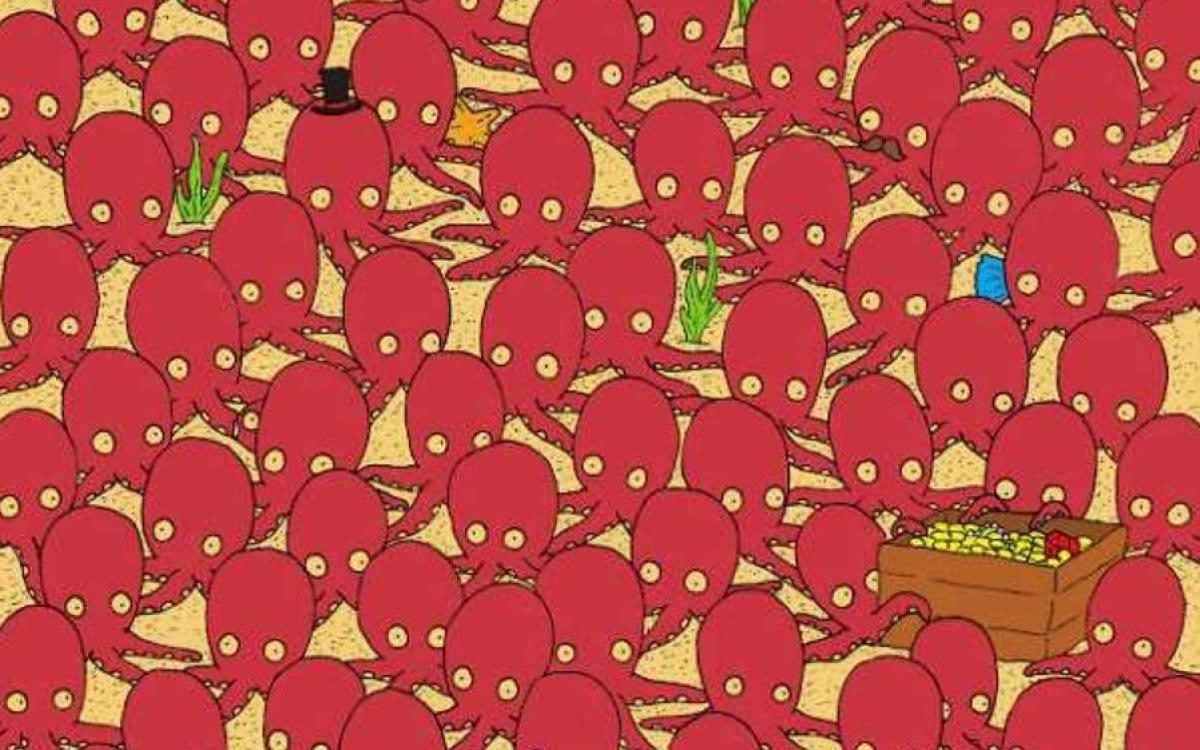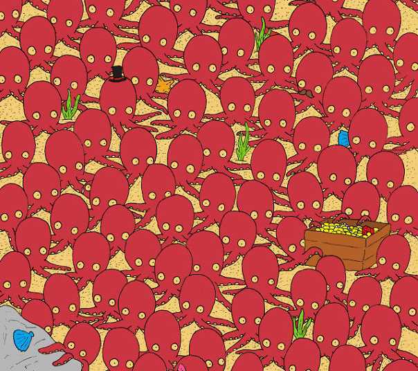 Slika prikazuje puno hobotnica koje izgledaju kao da su pronašle škrinju sa zlatom. Naš zadatak je pronaći ribu ovdje.