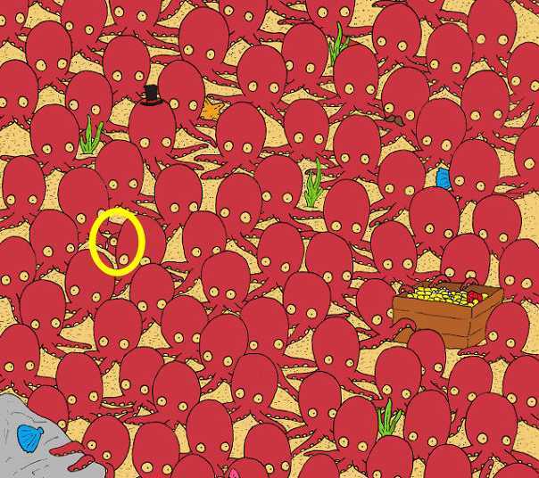 Niste mogli pronaći hobotnicu? Prihvatite savjet: pogledajte u središte slike, a zatim malo ulijevo. Tamo se sakrila riba. Točan odgovor je zaokružen žutom bojom.