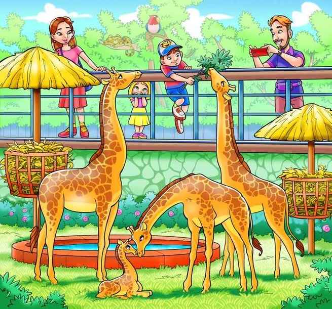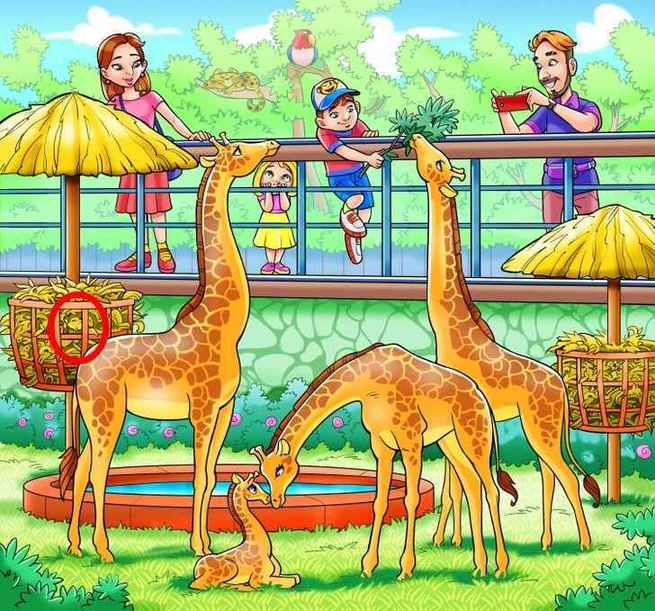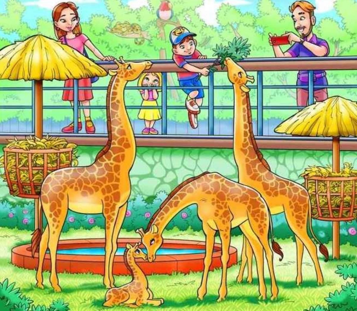 Slika prikazuje obitelj u zoološkom vrtu. Muškarac snima žirafe telefonom, dok njegova djeca i žena gledaju životinje. Ovdje se negdje skriva majmun kojeg morate pronaći.