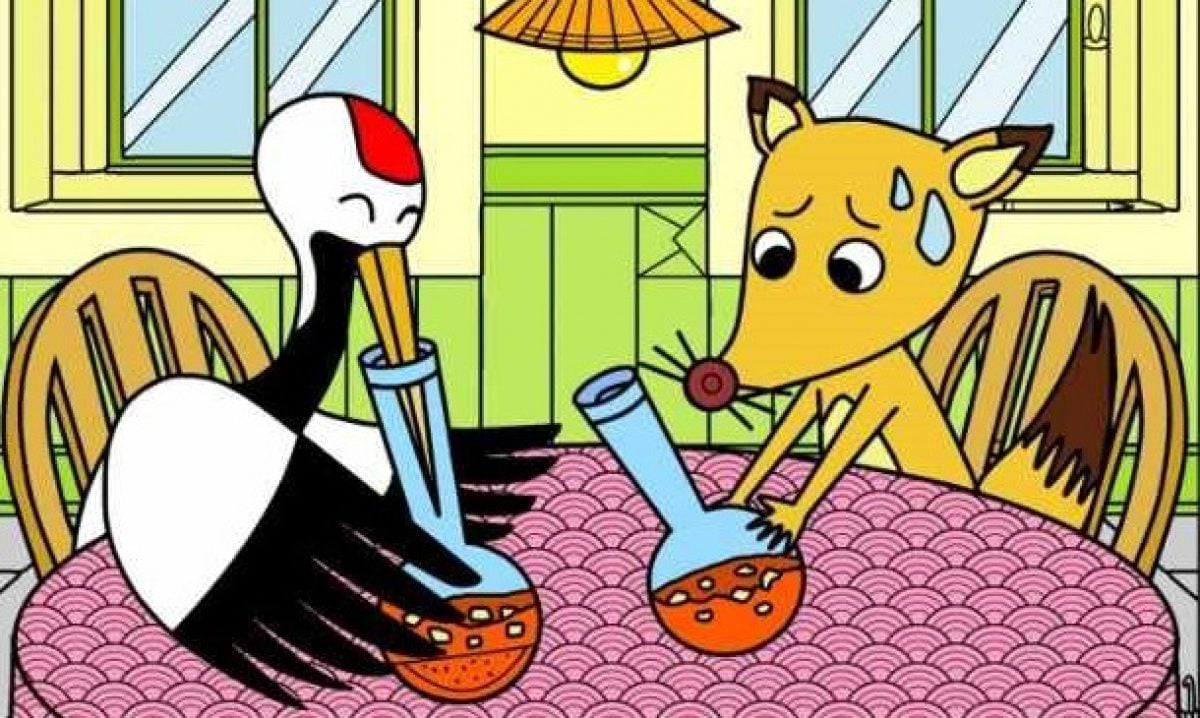 Na slici vidimo scenu iz poznate bajke o lisici i ždralu. Dok ždral radosno jede hranu iz uske bočice, lisica samo zavidno gleda u posudu iz koje ne može dobiti ukusnu hranu.