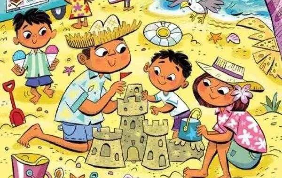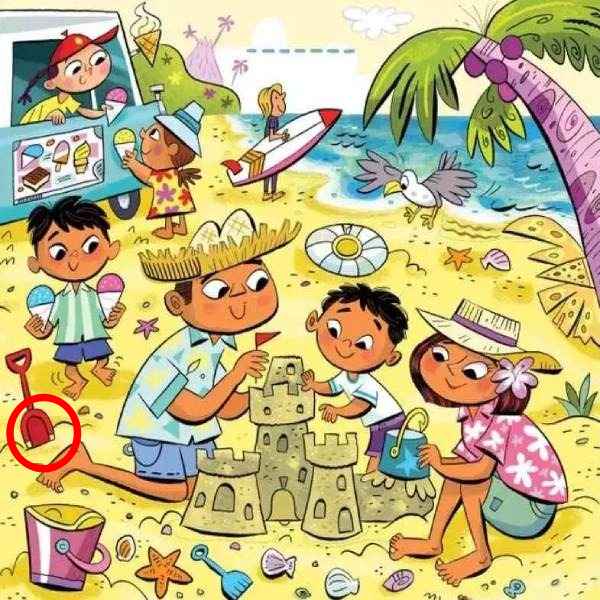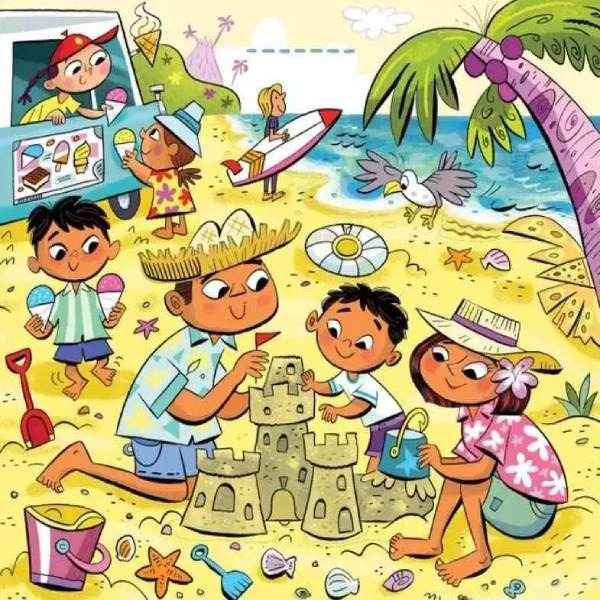 Na slici vidimo zanimljiv zaplet – tata, mama i njihova djeca odmaraju se na plaži i grade dvorac od pijeska. Dvoje djece – dječak i djevojčica – otrčali su po sladoled.