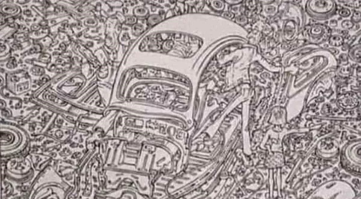 Na slici je čovjek koji sjedi u garaži u kojoj ima puno rezervnih dijelova. U središtu je rastavljeni automobil, a kraj muškarca je, po svemu sudeći, njegova supruga koja ga je došla pozvati kući. Naš zadatak je pronaći mačku ovdje.