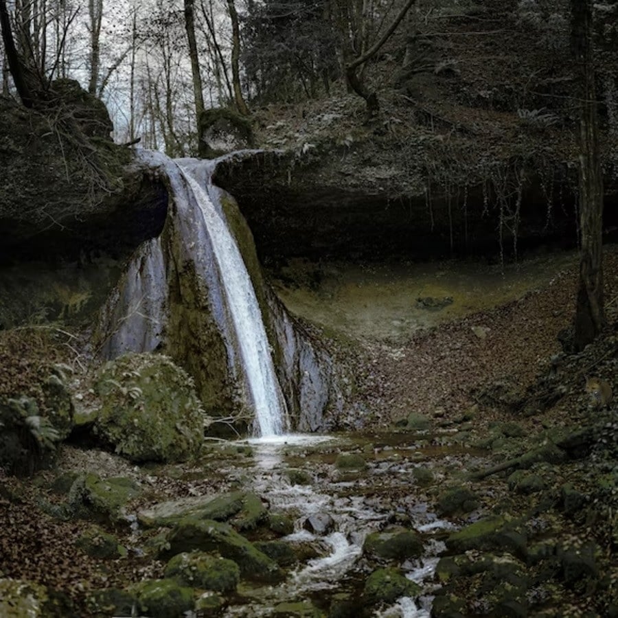 Na fotografiji vidimo šumski krajolik s vodopadom. Voda pada na mahovinom obraslo kamenje koje leži ispod. A shema boja koja uokviruje šumu sugerira da slika prikazuje jesenski krajolik.